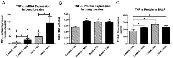 Our attention next focused on the elaboration of pro-inflammatory cytokines. As expected, there was a significant increase in the expression of IL-1β mRNA and protein in whole lung homogenates from control mice after SHS exposure (Figure 5A,B). There was also a significant increase in the elaboration of IL-1β by control mice exposed to SHS into BALF (Figure 5C). Similar assessments also demonstrated that there was no increase in the expression of IL-1β message or protein when total mRNA or protein were screened in lysates from Cldn6 TG mice exposed to SHS (Figure 5A,B). While there was a significant increase in the secretion of IL-1β by Cldn6 TG mice exposed to SHS compared to Cldn6 TG mice exposed to RA, SHS-induced IL-1β secretion was significantly decreased in Cldn6 TG mice compared to controls (Figure 5C). TNF-α is another pro-inflammatory cytokine synthesized and secreted following exposure to tobacco smoke. Our data demonstrate a significant increase in the expression of TNF-α mRNA from lysates obtained from SHS-exposed Cldn6 TG and controls (Figure 6A). Interestingly, TNF-α protein expression in whole lung lysates was elevated, yet not differentially increased in relation to transgenic control programs (Figure 6B). Lastly, despite a higher baseline of secreted TNF-α into BALF by Cldn6 TG mice exposed to RA (Figure 6C), TNF-α secretion by Cldn6 TG mice was not significantly increased following SHS exposure whereas such secretion was markedly increased following SHS exposure of controls (Figure 6C).