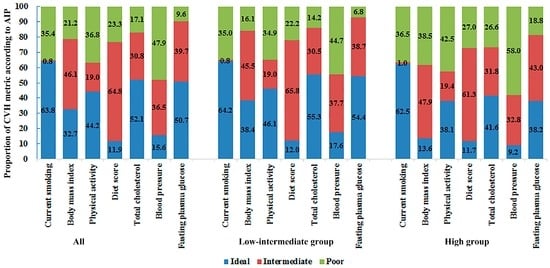 The distribution of CVH metrics according to AIP (low-intermediate vs. high). AIP, atherogenic index of plasma; CVH, cardiovascular health.