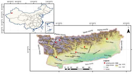 Bay County is in the southwest of the Xinjiang Uyghur Autonomous Region. It is located in the middle of the Tianshan Mountains, in the basin of the northern margin of the Queletagh Mountains and the upstream region of the Weigan River; specifically, it is between 80°37′39″–83°02′25″ E and 41°24′08″–42°38′52″ N []. There is one county town (Bay County town), and there are three building towns (Tirek, Sairam, Chaierqi), ten villages (Keyir, Kezili, Tuokesun, Yaturi, Kanqi, Bulong, Miqiki, Ombax, Daqao, Kariwahi), two state farms (Dawanqi, Yakeriki), one breeding farm, and one agricultural experiment station in this county. The northwest terrain of Bay County is low, but its southeast terrain is high. To the north of Bay County is the grand trunk of the Tianshan Mountains. It is more than 4500 m above sea level, with plentiful snow and many glaciers which can be found year round. Bay County is framed by the Queletagh Mountains to the west and south; it is between 1180 m and 1400 m above sea level.