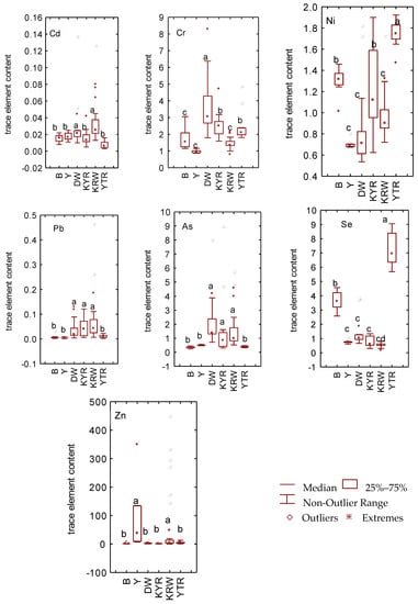The trace element concentrations in the drinking water of Bay County. Boxes with different letters were significantly different at p < 0.05. Significance was determined by nonparametric comparison (Kruskal-Wallis test. DW: Dawanqi; KYR: Keyiri; KRW: Kriwahi; Y: Yangchang; YT: Yaturi; B: Bulong.
