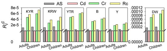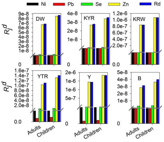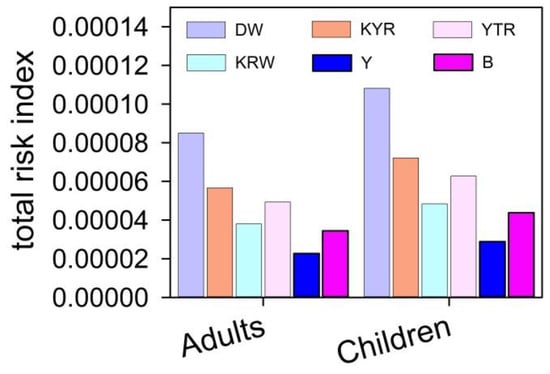 The total health risk for both adults and children induced by the trace elements for KYR, YTR, KRW, Y, and B regions is higher than the acceptable risk level (10−6) and lower than the priority risk level (10−4). The total health risk induced by the trace elements for the DW adult is higher than the acceptable risk level (10−6) and lower than the priority risk level (10−4), while the total health risk for the population of DW children reached 1.08 × 10−4, which is higher than both the acceptable and priority risk levels (10−4).