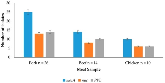 | Staphylococcus Species | Pork Isolates n = 26 (%) | Beef Isolates n = 14 (%) | Chicken Isolates n = 10 (%) | Total n = 50 (%) | p-Value |
