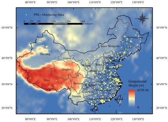 Many researches have proven that atmospheric particles from both anthropogenic emissions and natural sources are tightly linked to environment deterioration and climate change [1,2,3]. Some epidemiological studies have shown that fine particulate matter with an aerodynamic diameter no greater than 2.5 μm (PM2.5) has a positive correlation with respiratory and cardiovascular disease occurrence [4,5,6]. The measurement of ground-level PM2.5 mass concentrations is therefore of vital significance for effective air quality management. With a rapidly developing economy, China has been experiencing severe PM2.5 pollution that has aroused widespread public concern [7]. The quality of PM2.5 estimation often decreases along with the extent of spatial distance, although stationary ground measurements are reasonably accurate [8]. Consequently, acquiring an accurate estimation of PM2.5 exposure characterization at the national scale for China is necessary [9].