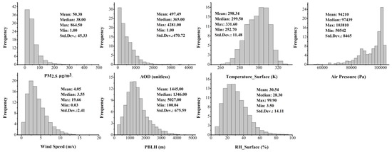 Histograms and descriptive statistics for PM2.5, AOD, surface temperature, atmospheric pressure, wind speed, planetary boundary layer height (PBLH), and surface relative humidity (RH) in the model fitting.