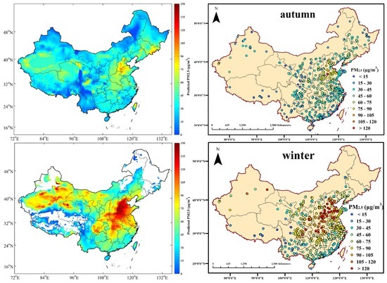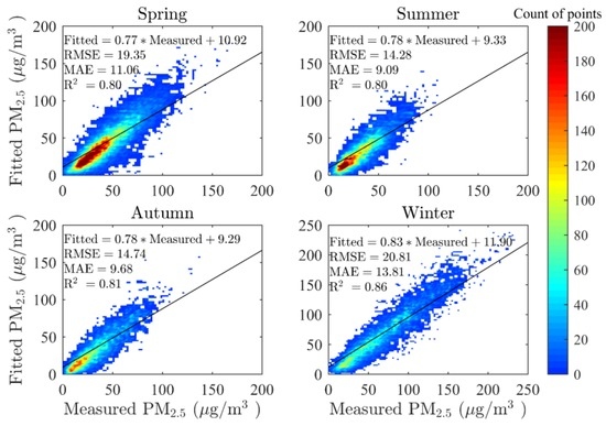 It should not be ignored that the slopes of the linear fitting equation are all near 0.8 and the intercepts range from 9 to 12 μg/m3, which indicates no apparent differences in the seasonal model-fitting results. Similar to many CV equations determined in previous studies using GWR models [29,37,40], the slope is less than 0.9 while intercept is positive. In this study, when the monitored PM2.5 was less than 50 μg/m3, our model tended to overestimate, but to underestimate when the monitored PM2.5 was larger than 50 μg/m3 on general situations. This phenomenon could possibly be explained by the mechanism of GWR model that variable coefficients tending to be similar when they are geographically close to each other. Therefore, estimated values would be more even when measurements differ sharply from each other in a small region. In other words, the overall estimated PM2.5 would appear to be slightly averaged from the measured PM2.5.