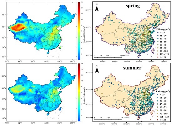 Figure 3 shows the cross-validation (CV) results for the real-time GWR model in four seasons. In this study, the four seasons were defined based on both astronomy and climate method conjunctively, namely, spring (March, April, and May), summer (June, July, and August), autumn (September, October, and November) and winter (December, January, and February). According to the model fitting, the CV R2 values are 0.80, 0.80, 0.81, and 0.86 for spring, summer, winter, and autumn, respectively, and the CV RMSE values are 19.35, 14.28, 14.74, and 20.81 μg/m3 for the four seasons, respectively. The fitted results in this study could therefore account for over 80% of the variability in the corresponding PM2.5 mass concentrations. These fitting results were relatively good at the national scale when compared to other studies in China (cross validation R2 achieved 0.64 and 0.79 in annual average, respectively) [24,29]. Generally speaking, summer possessed the lowest mass concentration of PM2.5, followed by autumn. PM2.5 concentrations were higher in both spring and winter, however, most values in spring remained low. The decision coefficient, R2, was a little higher in winter than in other seasons, which was possibly caused by fewer satisfactory points in the northeastern and western regions of China, because MODIS could hardly retrieve AOD on surfaces with strong reflectance, such as snow-covered surfaces that are predominant in those regions during winter time. However, the maximum CV MAE value was reached in winter while the lowest value of MAE appeared in summer (9.09 μg/m3). It is apparent that the CV MAE had no relationship with CV R2, but was linked to the value of PM2.5. In other words, the CV MAE demonstrated a proportional relation to the mass concentration of PM2.5, rather than to model performance.