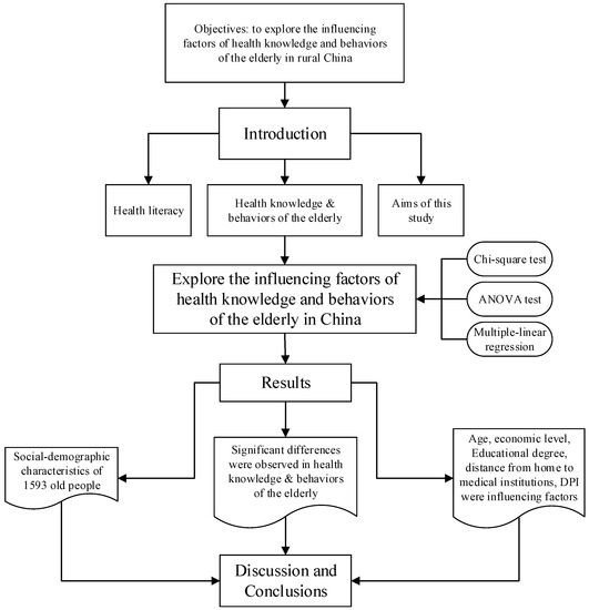 We provide a structure model of this research manuscript (Figure 1) to explain and state the idea of our writing. By the literature study and field investigation, we explored the influence factors of health knowledge and behaviors of the elderly in rural China through Chi-square test, ANOVA test and multiple-linear regression. Then, we analyzed the results, discussions and got the conclusions.