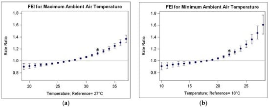Studies have used a variety of different temperature metrics to assess heat exposure, including ambient air temperature and measures that integrate the influence of temperature and humidity, such as apparent temperature and the heat index. Different daily measures, expressed as maximum, minimum, or average measures of these temperature metrics, may indicate different mechanisms and effects. For example, heat-trapping urban environments may intensify heat stress by preventing overnight cooling, which is indicated by minimum air temperature [58,80]. Average temperature most likely represents the experience of the entire day and night [76,81]. ED visits for cardiovascular and respiratory diseases have been shown to be positively associated with diurnal temperature range when it was above a certain range [82,83]. Because each measure of temperature may be suited for certain scenarios and because FEI has not been previously studied in depth as an outcome in relation to heat exposure, an objective of the present study was to characterize the heat-FEI morbidity relationship for different exposure metrics.