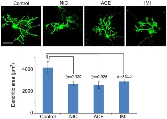 After 2 days, NIC, ACE, or IMI (final concentration 1 μM), or DMSO (control; final concentration 0.001%) was added to the cell cultures at a final concentration of 1 μM with 0.8 mL of 1% fetal bovine serum. Every 2 days for the 16 days in vitro (DIV), half of the culture medium was replaced with fresh medium containing 1μM of NIC, ACE or IMI, or 0.001% DMSO. After 8 DIV, serum-free synthetic medium was used to prevent the growth of astrocytes. The serum-free synthetic medium consisted of Dulbecco’s modified Eagle medium/F12 (Gibco, Thermo Fisher Scientific, Waltham, MA, USA) with 10 μg/mL bovine insulin (Sigma-Aldrich), 100 μg/mL transferrin (Sigma-Aldrich), 30 nM sodium selenite, 5 nM thyroxine, 100 μM putrescine (Sigma-Aldrich), and penicillin-streptomycin (100 units/mL and 100 µg/mL, respectively; Gibco).