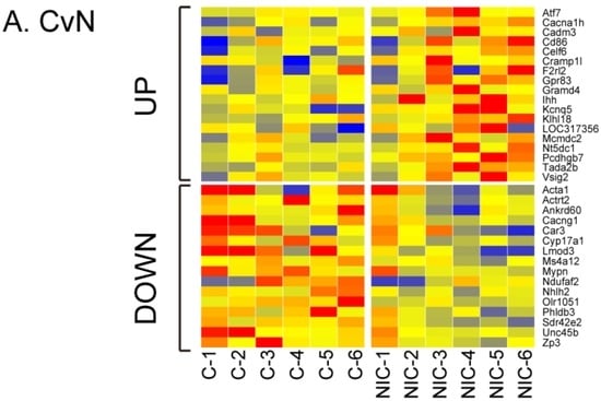 In the SFARI autism database, the following DE genes were registered: Celf6, which codes for a transcription associated protein and was common to CvN and CvI; Magel2 (melanoma antigen family L2), unique to CvI; and Ampd1 (adenosine monophosphate deaminase), also unique to CvI. Three types of CvN unique genes were registered in the autism KB database [54,55]: Cadm3 (cell adhesion molecule), Gpr83 (G protein-coupled receptor), and Acta1 (actin α1). Four CvA-unique genes were registered in the same database: Napb (related to amyotrophy), Rasl10b, Iqcf1, and Myog (transcription factors). Finally, three CvI-unique are also registered in the Autism KB database: Htr2c, Rbfox2 (an RNA binding protein), and Txk (a tyrosine kinase). The functions and correlations of these disorder-related genes are not yet clear, but given the developmental nature of autism, they may be involved in brain development.