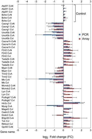 qRT-PCR was used to validate microarray data for 20 randomly selected DE genes and two control genes. Almost all genes showed consistent trends between qRT-PCR and microarray results (Figure 5), with the Pearson correction coefficient of 0.80 between the qRT-PCR and microarray data. In Tada2b, log2 FC of PCR was noticeably lower than those of microarray, especially CvN. Of the 22 genes selected, changes in only three (Lyn, Pcdhgb7, and Dcdc2) were not confirmed by qRT-PCR. This may be because of differences in primer positions, resulting in transcript variants or degradation of mRNA.