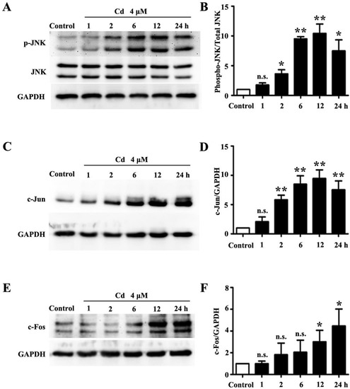 Higher concentrations (>10 μM) of Cd induce oxidative stress which consequently activates the JNK pathway in various types of cells [19]. In this study, we examined whether low dose Cd exposure activates the JNK pathway in HRMCs by Western blotting. As shown in Figure 1A,B, the phosphorylated JNK was significantly increased with a peak at 12 h in HRMCs treated with 4 μM Cd, while the total levels of JNK protein and internal control GAPDH remained unchanged. Moreover, protein levels of c-Fos and c-Jun, the downstream effectors of the JNK pathway, were significantly increased (Figure 1C,E).