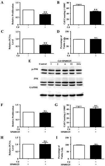 Low dose Cd inhibits proliferation of HRMCs via the activation of JNK pathway: (A) MTT assay of HRMCs treated with 4 μM Cd for 24 h. n = 6; ** p <0.01; (B) Cell counting of HRMCs with or without exposure to 4 μM Cd for 24 h. n = 3, ** p < 0.01; (C) Densitometry analysis of the immunoblots of PCNA from protein samples of HRMCs with or without exposure to 4 μM Cd for 24 h. n = 3, ** p < 0.01; (D) Trypan blue exclusion assay of HRMCs treated with 4 μM Cd for 24 h. n = 4; n.s. non-significant; (E) Representative blots of phospho-JNK and total JNK from protein samples of HRMCs exposed to 4 μM Cd at different time points with pretreatment with JNK inhibitor SP600125. The cells treated with SP600125 alone were used as control; (F) MTT assay of HRMCs treated with 4 μM Cd for 24 h with pretreatment with JNK inhibitor SP600125. n = 6; n.s. non-significant; (G) Cell counting of HRMCs treated with SP600125 or a combination of 4 μM Cd and SP600125 for 24 h. n = 3; n.s. non-significant; (H) Densitometry analysis of the immunoblots of PCNA from protein samples of HRMCs treated with SP600125 or a combination of 4 μM Cd and SP600125 for 24 h. n = 3; n.s. non-significant; (I) Tryplan blue exclusion assay of HRMCs treated with SP600125 or a combination of 4 μM Cd and SP600125 for 24 h. n = 4; n.s. non-significant. The values of the controls were normalized to 1 in A, C, F, and H.