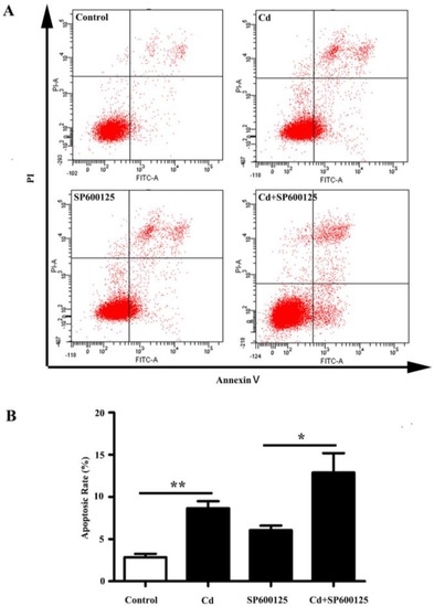 Effects of low dose Cd exposure on apoptosis of HRMCs. (A) Representative image of flow cytometry detection with annexin V/PI double staining for HRMCs exposed to Cd, SP600125, or a combination of Cd and SP600125 for 24 h; (B) Bar graph of apoptotic rate of HRMCs following flow cytometry. n = 3; ** p < 0.01; * p < 0.05.