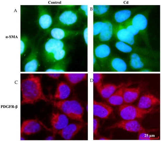 HRMCs were grown into monolayer on fibronectin-coated glass chamber slides and were then treated with 4 μM Cd for 24 h. The medium was aspirated, and the monolayers were washed with PBS, fixed with 4% paraformaldehyde, and washed 3 times with PBS for 15 min. Then the cells were permeabilized with 0.1% Triton X-100 for 10 min and washed 3 times with PBS for 15 min. Immunofluorescence was performed by staining with a mouse monoclonal antibody against α-SMAlabellling with fluorescein isothiocyanate (FITC) (Abcam, Cambridge, MA, USA) and a rabbit monoclonal antibody against PDGFR-β (Abcam) at a dilution of 1:50 overnight at 4 °C. The secondary antibody (1:200) for PDGFR-β was Alexia Fluor 546-labeled donkey anti rabbit (Thermo FisherScientific, Waltham, MA, USA) for 2 h at room temperature. The slides were photographed using an Olympus BX51 Imaging System (Olympus Corporation, Tokyo, Japan) with an excitation wavelength of 488 or 546 nm.