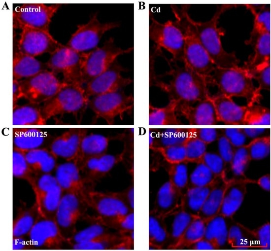 Cd causes disruption of cytoskeletal components, including actin, in several cell types [24,25]. Cell motility is regulated by the assembly and disassembly of the F-actin cytoskeleton, while F-actin also generates contractile forces to maintain the structure of intercellular contacts [26,27,28]. We examined the F-actin cytoskeleton of mesangial cells by exposing the cells to its interacting molecule phalloidin that was conjugated to a fluorochrome. We found that F-actin arrangement in HRMCs was not disrupted compared to controls, following 24 h exposure to 4 μM Cd (Figure 5A,B). In addition, a combined treatment with SP600125 and Cd did not significantly change the F-actin arrangement in HRMCs compared to the cells with SP600125 alone (Figure 5C,D).