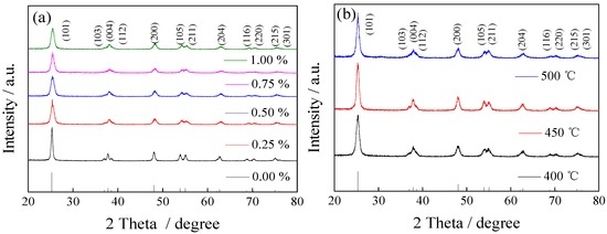 In accordance with previous literatures and studies [24,25,26], the La/TiO2 catalyst was synthesized by the sol-gel process with the following procedure. A mixture solution of 10 mL tetrabutyl titanate dissolved in 15 mL anhydrous ethanol, with stirring for 30 min, was noted as solution A. Another solution containing 10 mL ethanol, 2 mL acetic acid, 2 mL deionized water, and metal salts (La(NO3)3·6H2O) in the required stoichiometry was noted as solution B. Solution B was added dropwise to solution A under acute agitation to form a transparent, homogeneous sol. The wet gel of La/TiO2 was obtained by continuous stirring. After ageing at room temperature for 2 days and then drying at 90 °C, the xerogel was formed. The xerogel was crushed to get fine powder and further calcined in a furnace under air atmospheres. Heating rates were 5 °C·min−1 for all samples with 6 h holding time at different temperatures (400 °C, 450 °C, 500 °C) and a cooling rate of 10 °C·min−1 to achieve the La/TiO2 nano-photocatalyst. The rare earth La-doping ratio was set to 0%, 0.25%, 0.50%, 0.75% and 1% according to the mass fraction of La to TiO2.