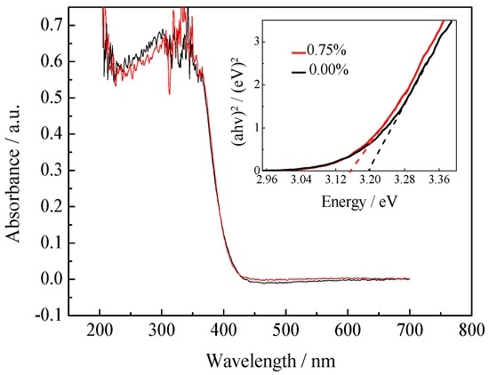 Figure 3 shows the UV-vis DRS of pure TiO2 and 0.75% La/TiO2 catalysts in the range of 200–700 nm. The data plots of absorption square versus energy in the absorption edge region are further estimated in the inset of Figure 3. The spectra of La/TiO2 indicate a little red shift in the band-gap transition compared with pure TiO2. A red shift of this type can be attributed to the charge-transfer transition between rare earth ions of 4f electrons and the TiO2 conduction or valence band. The light response range extends to the visible light, and the electron-hole pairs increased by the enhancement of light absorption ability. So, the photocatalytic activity might be improved [32,33]. The square of the absorption coefficient was linear with energy in the absorption edge region. Band-gap energies were deduced via extrapolating a straight line to the abscissa axis. The band-gap energy can be calculated by Equation (3) [34].