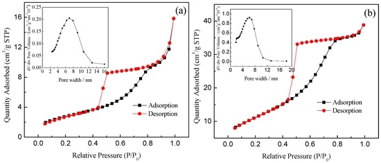 As seen from Figure 4, the N2 adsorption-desorption isotherms are characteristic of the typical Langmuir IV isotherm with hysteresis loop [36,37], which indicate that the synthesized samples have a mesoporous structure. The N2 adsorption-desorption isotherms of pure TiO2 and 0.75% La/TiO2 show the H2-type hysteresis loop with uniform particle accumulation in the hole. Generally speaking, it is considered as an inkbottle shaped channel with a small mouth and large cavity [38]. The BJH (Barrett-Joyner-Halenda) curve showed that the samples were with relatively narrow pore size distribution, and the mesoporous ranges from 2–10 nm. The most probable pore size of pure TiO2 was 6.99 nm, and the specific surface area was 10 m2·g−1. However, the most probable pore size of 0.75% La/TiO2 was 6.21 nm, and the specific surface area was 49 m2·g−1. The specific surface area of 0.75% La/TiO2 was significantly larger than that of pure TiO2. The relatively high surface area of La3+ doped samples confirmed that the frameworks of TiO2 have better adsorption ability. This may be due to the linkage between the rare earth ions and titanium by oxygen bridge, which effectively enhances the specific surface area of TiO2 [39]. The larger surface area, the more surface reaction sites, which is beneficial to improve the photocatalytic activity.