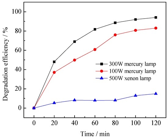 The photocatalytic degradation reaction was performed in the light-chemical reaction apparatus (Xujiang Electro-mechanical Plant, Nanjing, China). At first, the suspension was magnetically stirred for 30 min in the dark to ensure the adsorption-desorption equilibrium of benzohydroxamic acid on the catalysts. Then, the irradiation was provided by lamps of different intensity and different ranges of radiation (100 W mercury lamp, 300 W mercury lamp, and 500 W xenon lamp). Approximately 5 mL of reaction solution was taken at given time intervals and centrifuged. At last, UV-vis spectrophotometry was used to measure the absorbance of benzohydroxamic acid under wavelength of 229 nm. The removal efficiency (R) was calculated by Equation (1):