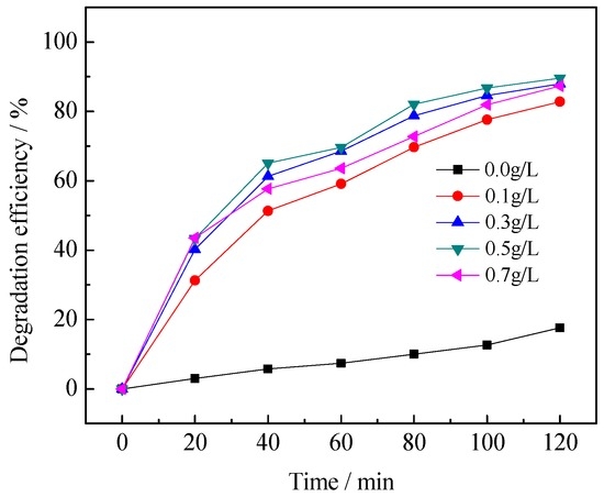 Figure 8 shows the variations in the ratio of degradation at different dosages of photocatalyst ranging from 0 to 0.7 g·L−1. It can be seen that the photocatalytic degradation efficiency increases with an increasing amount of the 0.75% La/TiO2 photocatalyst and reaches the highest value when the concentration is 0.5 g·L−1. There are three reasons to explain this: (1) the smaller dosage of La/TiO2 generates less electron-hole pairs, which leads to the lower photocatalytic activity; (2) the availability of active sites increase with the increase of La/TiO2 dosage; (3) overload of the photocatalysts would decrease the light penetration and increase radiation scattering by the suspension catalyst and finally reduce the degradation rate.