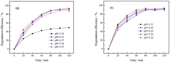 Effect of initial pH value on photocatalytic degradation of benzohydroxamic acid: (a) the pH value was adjusted by HNO3 and NaOH; (b) the pH value was adjusted by HCl and NaOH). Reaction conditions: C (benzohydroxamic acid) = 30 mg·L−1, C (catalyst dosage) = 0.5 g·L−1, 300 W mercury lamp, 0.75% La/TiO2, calcined temperature at 500 °C.
