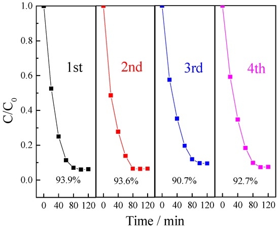 3.2.5. The Reusability of Photocatalyst