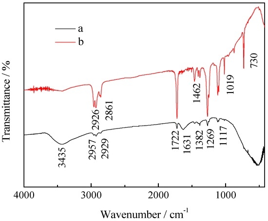 Figure 11 shows the FTIR spectra of 0.75% La/TiO2 (Curve a) and after 2 hours’ photocatalytic degradation of benzohydroxamic acid by 0.75% La/TiO2 (Curve b). The following information could be given by the analysis of FTIR spectra [47,48]: the characteristic peak of TiO2 is 400–800 cm−1, caused by the stretching vibration and bending vibration of Ti-O-Ti and Ti-O bond; the absorption located at 3435 cm−1 characterizes the hydroxyl groups of Ti-OH at weak surface active sites, with physisorbed water molecules bound by weak hydrogen bonds with OH– groups of TiO2 surfaces; the characteristic peaks of 1117, 1269 and 1722 cm−1 corresponding to the Ti-O-C, the C-O, and C=O in Curve b are stronger than those in Curve a; 730 cm−1 may be a long carbon chain of CH2 in Curve b; stretching vibration of CH3 groups is around 2926 cm−1 and 2961 cm−1. All the information above could suggest that the benzene ring in benzohydroxamic acid had been fractured, and some alkanes or ester compounds had been generated by the photocatalytic reaction.