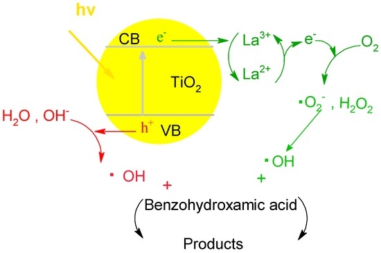 Figure 12 illustrates the possible interfacial charge transfer processes. Element La exists in the stable form of La3+ as described in the section of XRD and XPS, which might trap the photoexcited electrons to produce La2+. However, La2+ is relatively unstable: the electrons can be easily detrapped and transfer to O2 adsorbed on the surface of TiO2 to produce the ·O2− [49]. ·O2− and the photoexcited holes would react with H2O, OH−, or H2O2 to produce ·OH. Then, benzohydroxamic acid would be oxided to products including CO2 and H2O. The doped La3+ could increase the electron transfer from the surface of the catalyst and decrease the recombination of photogenerated electrons and holes.