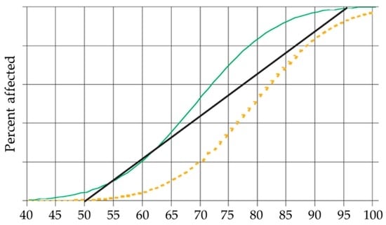 Hypothetical exposure–risk curves and estimated percentages of affected people [33].