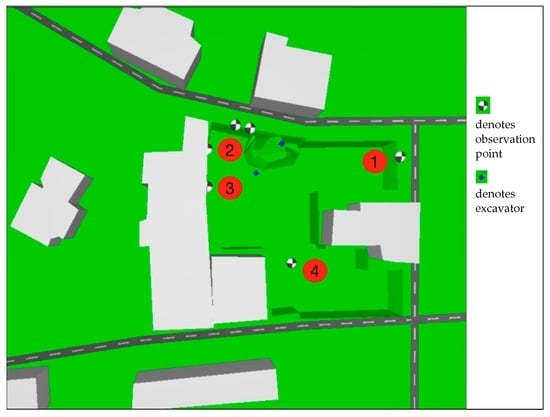 Based on the site conditions and the national standards [8], noise observation points are set to collect noise data. Four of the noise observation points, which are labeled with numbers, are used to measure the noise level of the site, while the other points are set to collect mechanical noise data. The orientation of the observation points and the site terrain are shown in Figure 2.