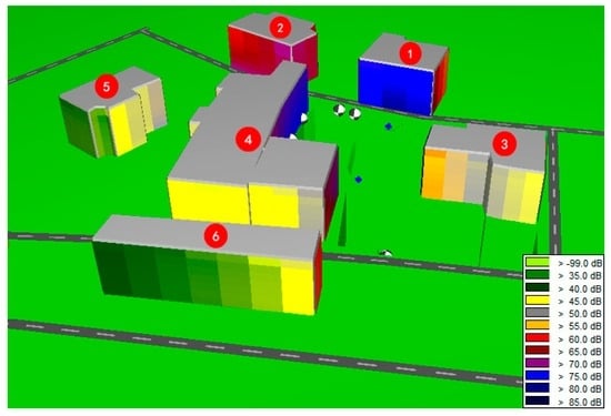 Simulated noise levels in the surrounding buildings (unit: dB(A)).