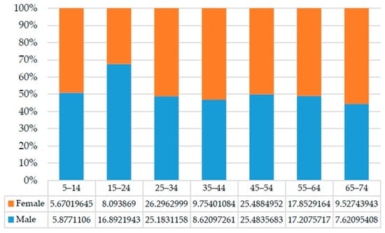 After noise data, population information (e.g., size, age and gender) is important for model application. Because the aim of this case study is not to investigate environmental impacts, but rather to present an application of the assessment model, the population-related data used were based on data collected by the local statistical bureau. According to the latest population census statistics of Beijing municipality [91], the per capita floor space for people living in Xuan Wu is 23.54 square meters. Combined with the building area, the population size of each building can therefore be inferred. Then, the expected age and gender distributions for the population in each building can be deduced based on local data and the population size. The Beijing Statistical Association has published census information for the Xi Cheng district that accounts for 10 years and includes the sex ratio [91]. In this case, the distributions of age and gender are assumed to be consistent with that of the Xi Cheng district. For the benefit of data integration, the age interval was set to 10 years, as shown in Figure 4.