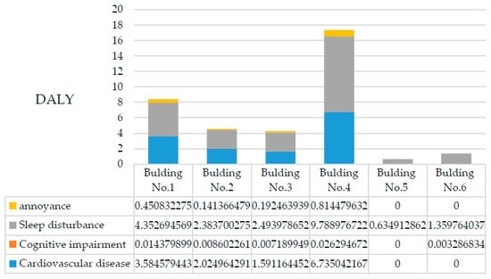 Based on the above analysis of health risks and VSLY using the presented data on noise levels and population, the DALYs for each building were calculated and are presented in Figure 5 and Figure 6. In the process of DALY calculation, the disability duration of each health impairment, D, is consistent with the duration of the construction period because the evidence showed that these health impairments would disappear once the noise faded away [33].