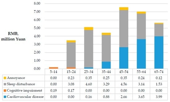 The present study clearly shows that noise is an important reason for the environmental impact of construction projects, as revealed by the higher health risk faced by the communities neighboring the studied construction site. Among the health risk categories assessed, sleep disturbance formed the largest proportion (more than 55%) and was pervasive in each building. This conclusion is consistent with the fact that most complaints associated with construction noise occurred at night. However, as another widely accepted basis for evaluating the impact of noise, annoyance was not found to have a strong impact, which is likely because its threshold in China is set at 60 dB(A), which is over 10 units higher than that in Europe. Thus, lowering noise emissions at night, developing low-noise equipment and avoiding performing noisy work during nighttime hours represent the most efficient ways to improve a building’s environmental performance, as well as to meet policy goals. The second most widespread health risk in this case was cognitive impairment, which is likely because noise exposure easily challenges a juvenile’s attention. Because only people aged between 5 and 19 years have been shown to be sensitive to NICI, this health risk is only responsible for approximately 0.36 DALYs, which is the smallest calculated health risk. However, cognitive impairment has a negative effect on learning, which is very important for children’s futures. Thus, both the government and contractors should pay special attention to this factor. Compared with the aforementioned risks, CVD only occurred in four buildings but caused approximately 13.93 DALYs, which accounted for 40% of the estimated environmental impact of construction noise. Due to its lethality, which leads to YLL, and the increase in mortality with age, CVD was identified as the most serious health risk for older individuals.