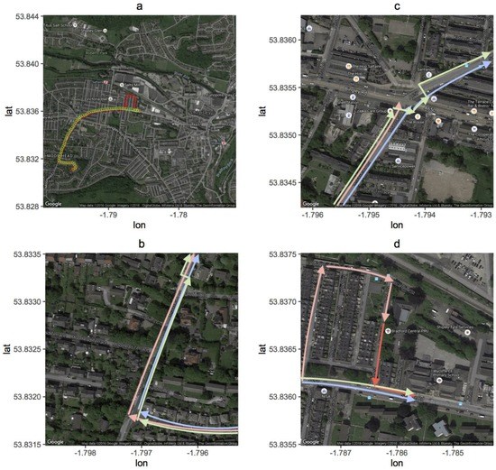 Map depicting the route to school in the morning. (a) The journey to school begins in the bottom left-hand corner (the house) and finishes in the top right-hand corner (the school). The green markers represent the route for the walkers while the red markers are those for the car commuter. The detour at the end of the journey for the car commuter is for parking the car; (b) The beginning of the route (red is the car, green is the North Walker and blue is the South Walker; (c) The intersection. (d) The final segment of the journey close to the school.