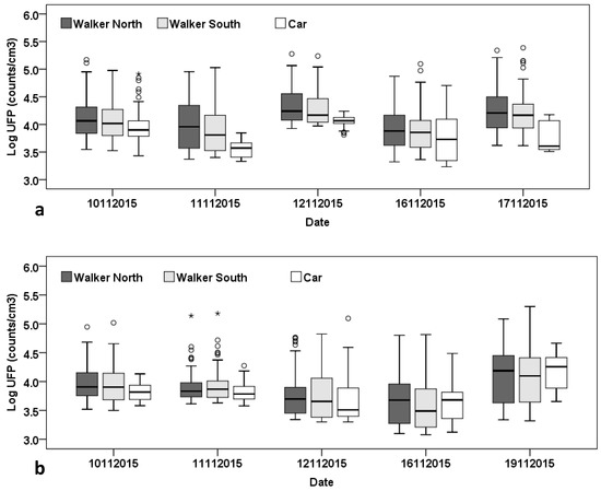 Each participant was equipped with an ultrafine particle counter (P-Trak) logging exposures at 10 s resolution throughout the period of the commute. The device was carried in the hand by the walkers with the inlet of the device facing forward. For the car commuter, the monitor was placed on the front seat with the sensor exposed to the in-vehicle air. Commuting in the morning began at 8:20 a.m. to ensure arrival at 8:40 a.m. in time for the commencement of school at 8:45 a.m. Travel home at the end of the day started at 3:20 p.m. allowing time for packing up for school that ends at 3 p.m. Note that the start and commute times for the pedestrians were fixed to ensure travel on the same road segments at the same time each day and that all pedestrian commutes were 20 min.