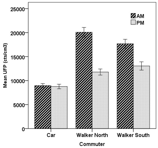 Figure 4 shows two examples of the time series of UFP exposure (one for the morning commute and one for the afternoon commute) for both of the walkers and also the car commuter. Note that for both of the walkers, the concentrations remain low for the time spent along Roundwood Road where the traffic flows are very light. In the morning, a large peak is observed soon after the walkers reach Moorhead Lane, where the traffic is heavy and the road is enclosed with a tall brick wall on one side (and a very narrow footpath) and tall overhanging trees on the other side, suggesting some trapping of air. After the North Walker crosses the road at the pedestrian crossing, the route requires the pedestrian to pass cars that are queued up for the major intersection. The small peaks from 8:28–8:30 a.m. for the North Walker are largely absent for the South Walker travelling on the side opposite to the queued traffic. Peaks are also observed for both walkers as they walk along the Saltaire Road segment. The car commuter experiences relatively low exposure throughout the journey, except near the end for the short walk to the school from where the car has been parked. In the return journey at the end of the school day, peaks are observed for both pedestrians along the length of Saltaire Road and through the major crossing. Some peaks are observed for the North Walker along the Moorhead Lane component while passing traffic queued for the intersection, though the peaks are less frequent and generally smaller than during the morning commute. Exposures for the pedestrians are relatively low for the remainder of the journey. For the car commuter, some modest peaks are observed while walking to the car and also while driving along Saltaire Road with levels very low beyond that point.