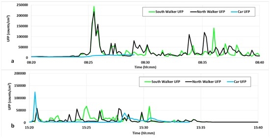 Example of UFP exposure for a commute (a) 17 November 2015 morning and (b) 12 November 2015 afternoon for the two walking routes and the car commuter. Note the peak in concentration that occurs shortly after 8:25 a.m. for the pedestrians when they reach a partially enclosed stretch of road and the shorter duration of the commutes for the car commuter.