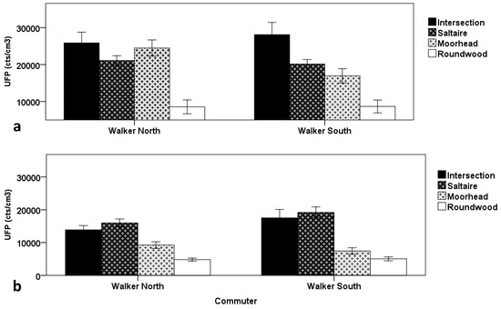 Figure 5 shows the commute mean UFP exposure split by time of day as well as by road segment, whether Roundwood, Moorhead, Saltaire, or the time spent passing through the intersection, focussing only on the two walkers. During the morning, the highest averages are experienced while in the intersection segment, either waiting to cross at the signalised pedestrian crossing or while crossing. During the afternoon, the levels experienced at the intersection are also high, though slightly lower than while travelling along the heavily congested Saltaire Road. High levels are also experience by the walker travelling on the north side of the road along Moorhead Lane, immediately adjacent to queued traffic entering the main intersection along the route. The Roundwood road segment, devoid of any significant traffic, consistently results in the lowest mean exposure amongst all of the road segments, both in the morning and in the afternoon.