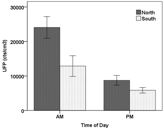 Mean UFP concentration for the Moorhead Road segment. The error bars are the standard errors of the mean (SEM) for the five commutes in each category.
