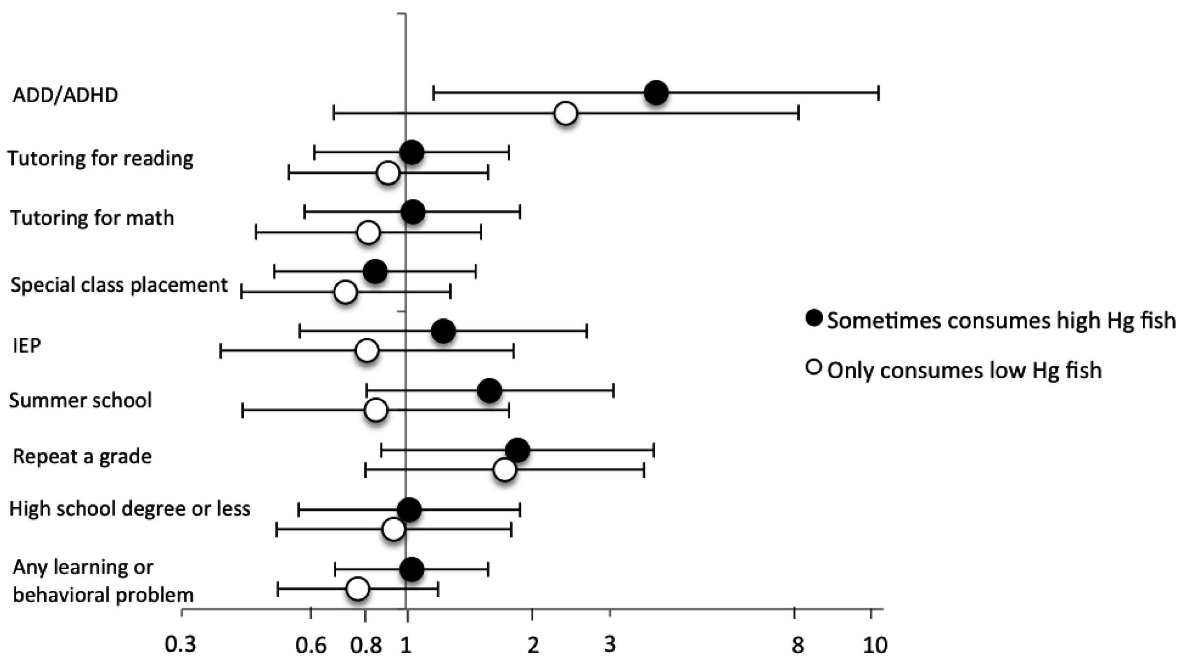Although only 6% of participants typically ate high-mercury fish, another 50% of fish eaters reported occasional high-mercury fish consumption. More so than for other exposure metrics, frequency of high-mercury fish consumption was positively associated with markers of socioeconomic status, particularly maternal education and paternal employment (Table 4). When we compared participants who sometimes ate high-mercury fish and those who only ate low-mercury fish to non-fish consumers, high-mercury fish eaters had the highest odds of every outcome (Figure 1). However, with the exception of ADD/ADHD, associations were not statistically significant. We were unable to obtain stable effect estimates for occasional and typical high-mercury fish consumption separately due to small sample sizes.
