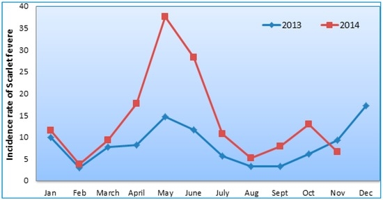 It has been well known that scarlet fever is a seasonal infectious childhood illness caused by Group A Streptococcus bacteria (Group A beta haemolytic streptococci (GABHS)). Scarlet fever predominately occurs in school children aged between 2 and 10 years. Generally, it spreads by the aerosol route (inhalation), but may also be able to spread through skin contact or by fomites [1,2,3,4]. So far, it is not normally considered as a food- or milk-borne illness, as an outbreak noted in China due to infected chicken meat [5,6]. There are currently no vaccines available to protect against S. pyogenes infection (the vaccine developed by George and Gladys Dick in 1924 was discontinued due to its poor efficacy) [2,3]. However, this disease can be fully cured and complications prevented by antibiotic application [1,2,3]. Remarkably, the trend of scarlet fever outbreaks has been increasing among the school children in mainland China and other countries, as well [7,8,9,10]. Therefore, it is still regarded as an important public health problem in China [11].