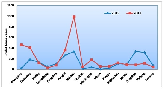Distribution of scarlet fever cases in Beijing districts, 2013–2014.
