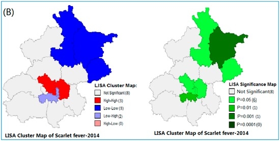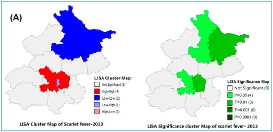 Local Moran’s I analysis (LISA) of Scarlet fever clusters in Beijing, from (A) 2013 and (B) 2014.