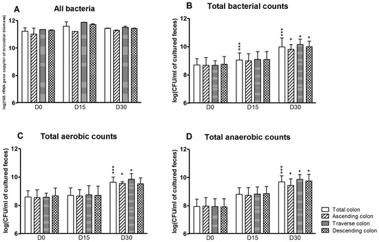 Total bacteria counts for the SHIME®’s colon as a whole and for each of the individual colon reactors at the end of the control period (D0) and after 15 and 30 days of exposure to pesticide chlorpyrifos (CPF) 1 mg/day in oil (D15 and D30). (A) Total bacterial counts determined by qPCR (Polymerase Chain Reaction) (log 16S rRNA gene copy/mL of microbioal biomass); (B) Total bacterial counts determined by plate culture (log CFU/mL of cultured feces); (C) Total cultured aerobe counts (log CFU/mL of cultured feces); (D) Total cultured anaerobe counts (log CFU/mL of cultured feces). Data are expressed as the mean ± Standard Deviation (SD) and were analyzed in a Kruskal Wallis test and then a Mann Whitney test. The level of statistical significance is indicated as follows: * p < 0.05; *** p < 0.001.