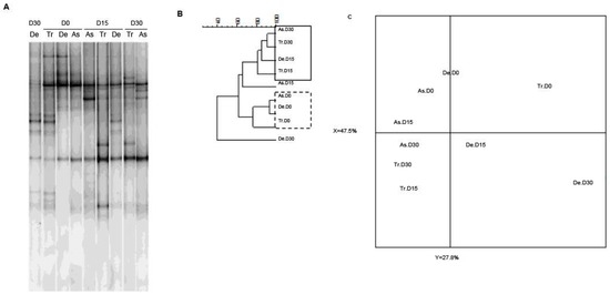 The TTGE fingerprint for bifidobacteria in the three colon reactors after 0, 15 and 30 days of exposure to CPF 1 mg/day in oil (D0, D15 and D30, respectively). (A) TTGE of bifidobacterial 16S rRNA gene amplicons of fecal samples taken from the colon vessels (As: ascending; Tr: transverse; De: descending); (B) The Pearson dendrogram for the reactor samples at D0, D15 and D30; (C) Results of a PCA of the samples from each reactor. The x and y values were 60.9% and 29.3%, respectively.