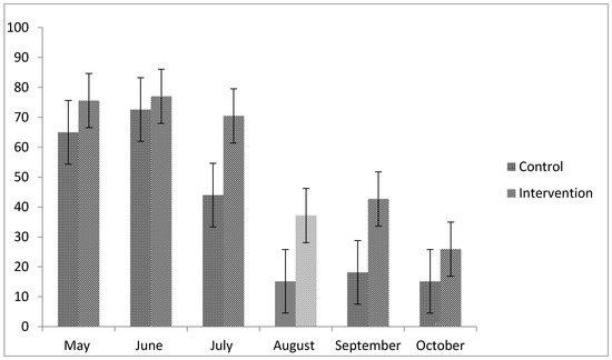 Percentage of high-intensity interval training (HIIT) exercise sessions attended (depicted with 95% confidence intervals). Note that summer vacation started at the beginning of August (lighter color to indicate summer vacation).
