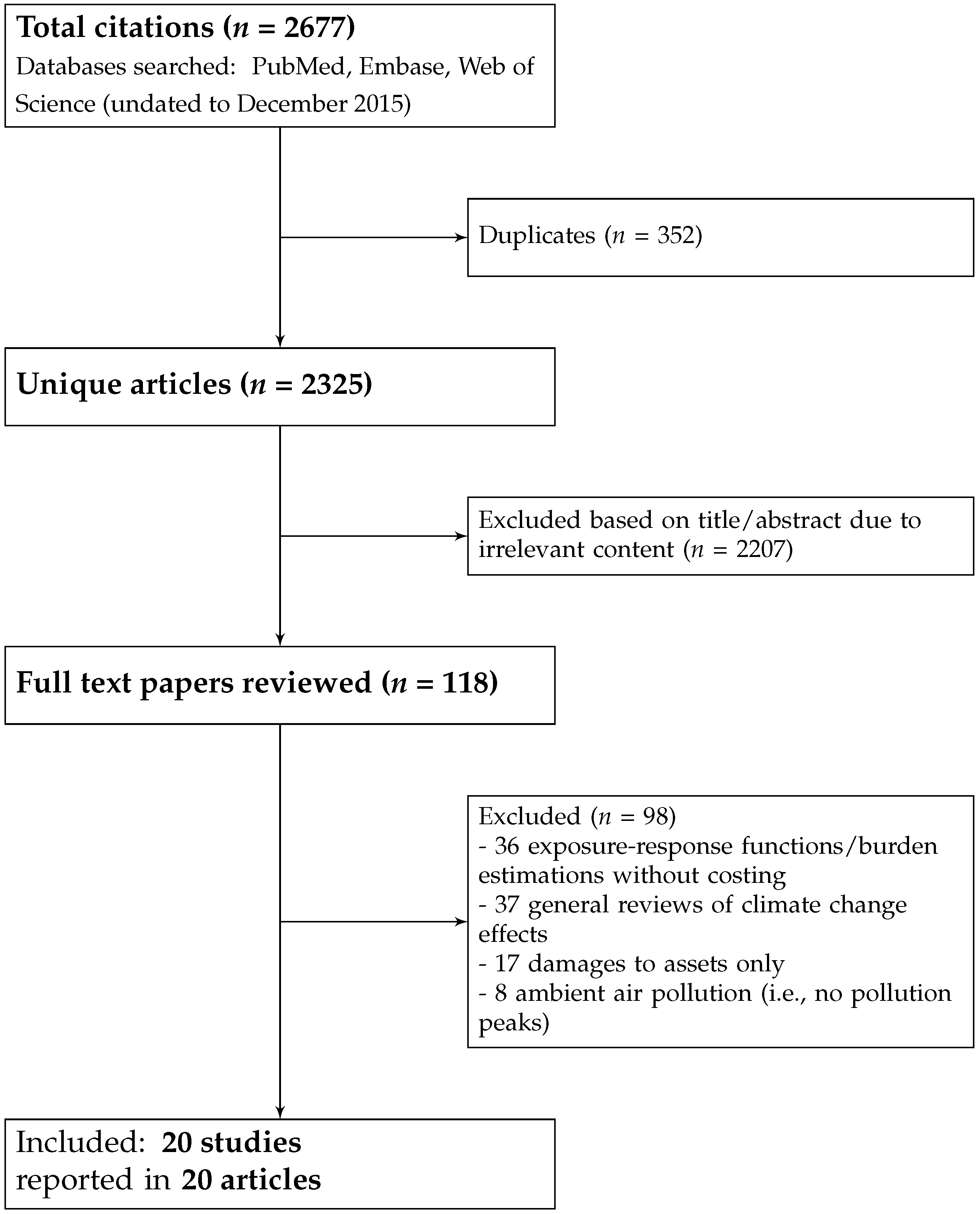 The document selection process, underpinned by the three above-mentioned inclusion criteria, is summarized in Figure 1. After removing duplicates, the search led to the identification of 2325 distinct articles, 2207 of which were excluded by one reviewer (Laetitia Schmitt) based on title and/or abstract. These excluded articles were either on natural or mechanistic systems (n = 869) or their content was irrelevant to weather-related extreme events (n = 1338). Irrelevant articles pertained to five main categories: diseases not related to extreme events; medical therapies; burns; occupational heat exposure and ambient air pollution, since only peaks in exposure or alternatively, on pollution levels during heat waves were deemed relevant to the research question.