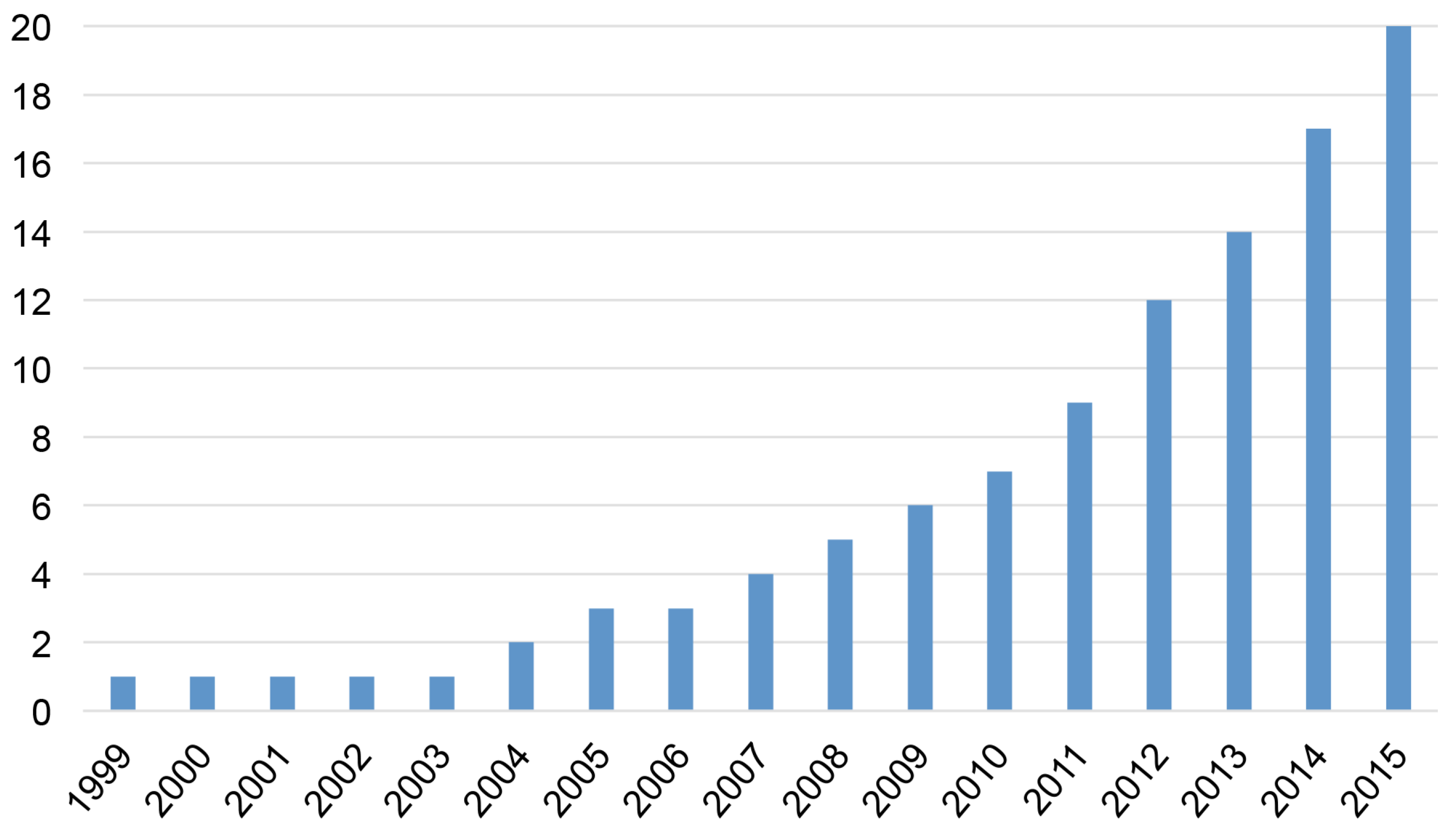 Despite the absence of date limitations in the search, the earliest relevant study was published in 1999, and two-thirds (13 out of 20) of the articles were published over the last five years (2011–2015). As Figure 2 indicates, the total number of relevant publications has increased seven-fold over the last decade. The implied growth rate is higher than the background increase in the global number of scientific publications (estimated at 5.6% per year over 1997–2006 for scientific publications in PubMed Medline [40]) and suggests that the economic evaluation of the health consequences of extreme weather events represents a very recent, but now rapidly-growing field of research.
